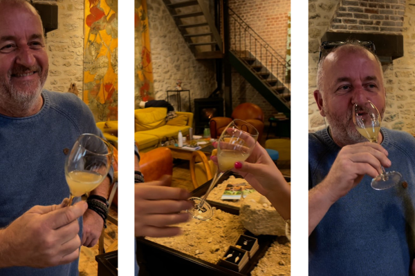 L'atelier se clôture par une dégustation de trois cuvées, dont le Champagne Anthocyane, création de Stéphane et Isabelle Keyser, propriétaires de l’Artelier dans ma cour.