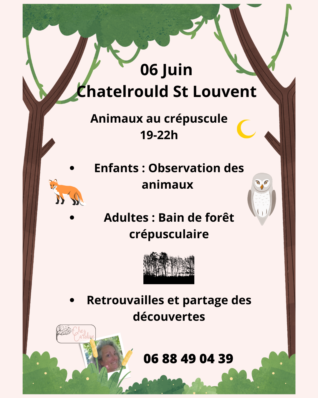 Animaux au crépuscule. Enfant : observation des animaux. Adultes : bain de forêt crépusculaire. Retrouvailles et partage des découvertes.