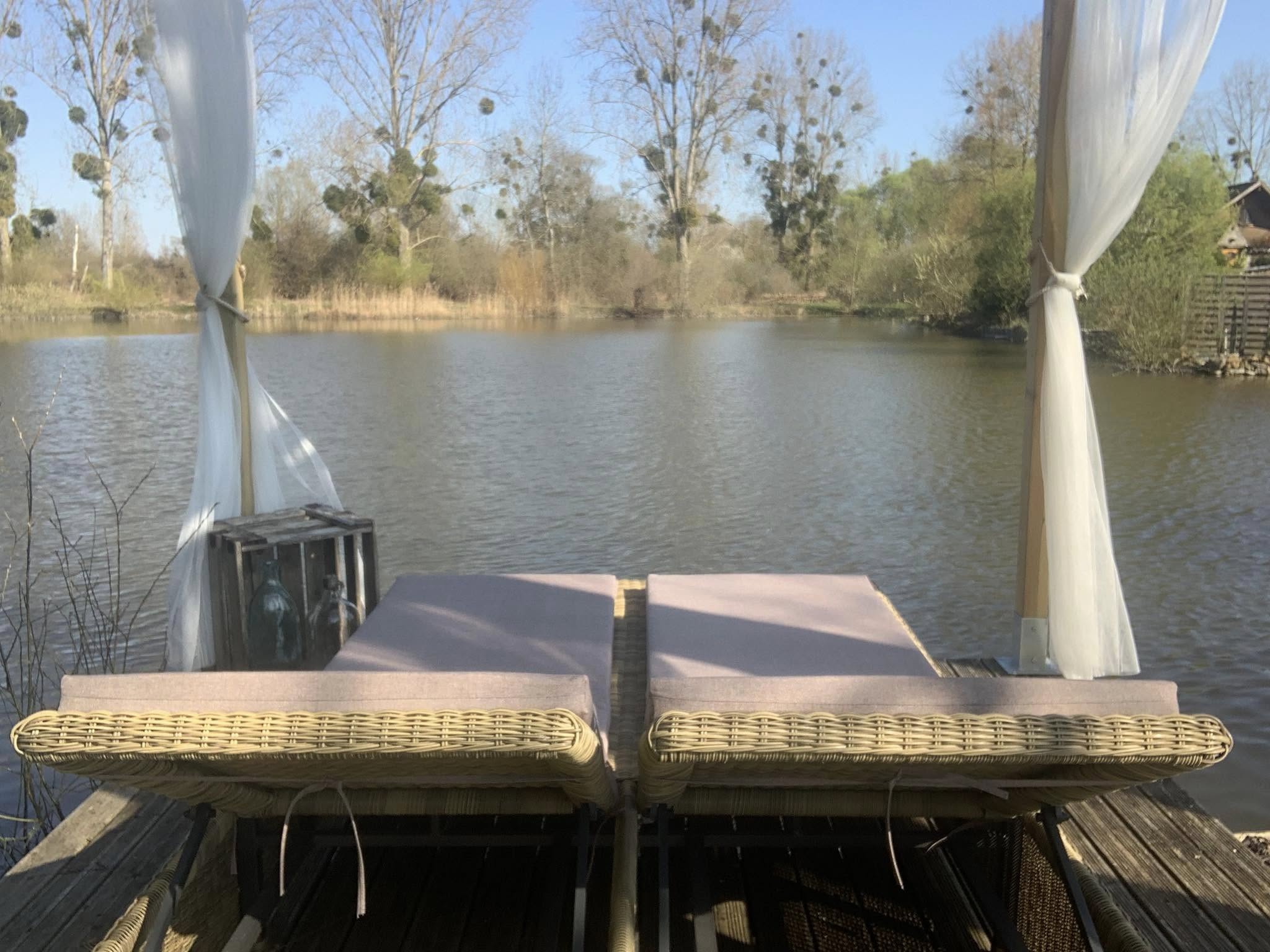 Le logement dispose d’un jacuzzi extérieur avec jets massants et jets d’air, ainsi que d’un salon de jardin offrant une vue splendide sur l’étang, accessible à la pêche.