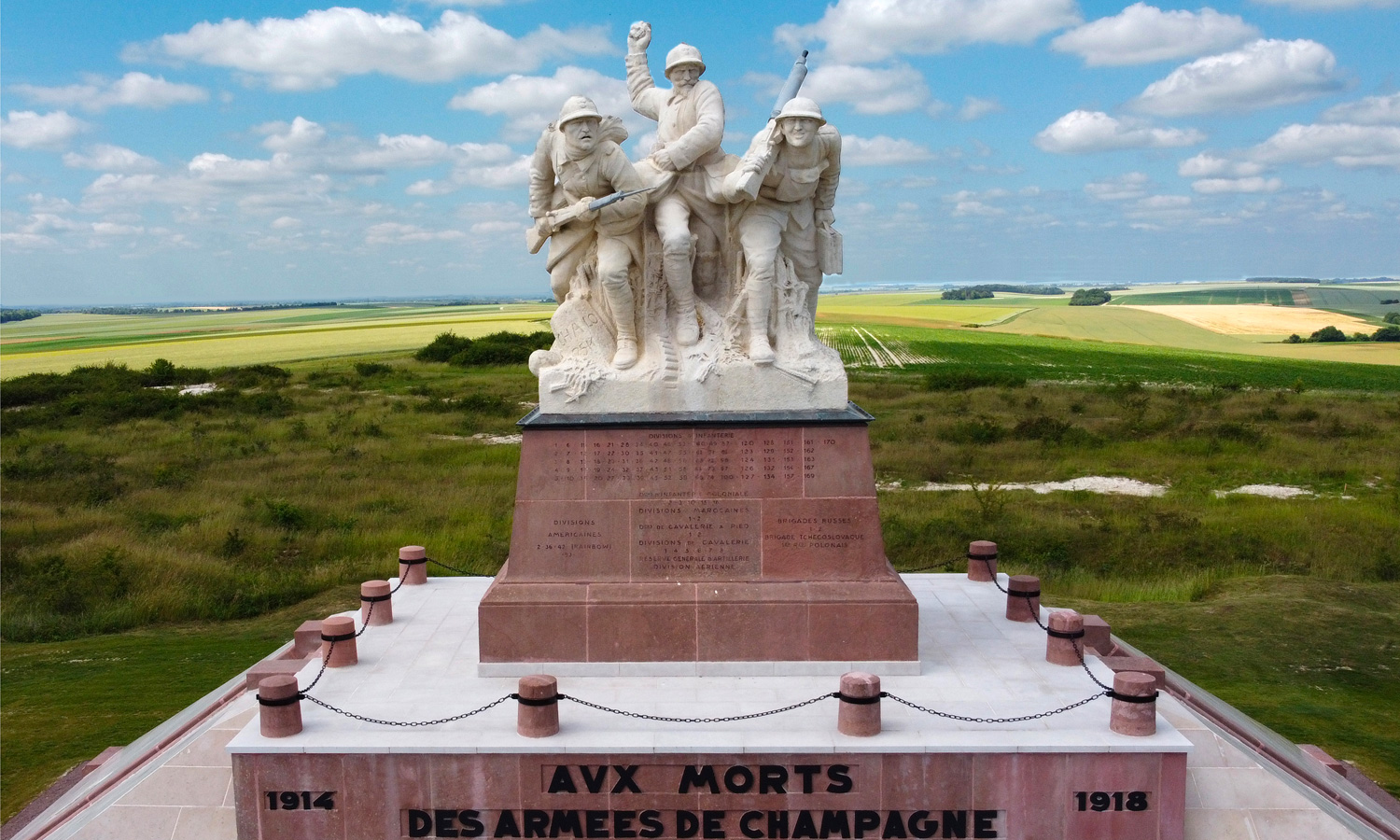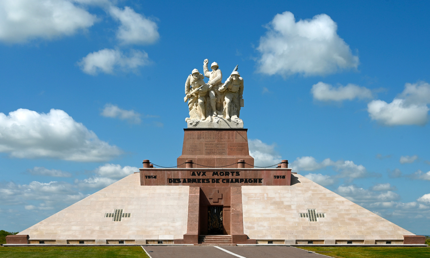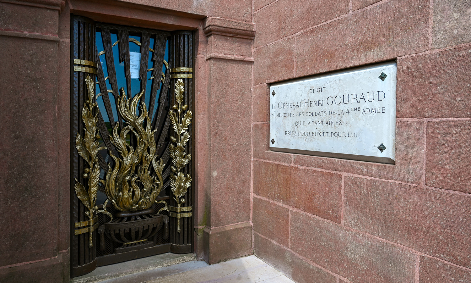 Sur le socle sont inscrits les numéros des divisions françaises et alliées qui ont combattu en Champagne. A l’intérieur du monument se trouve une chapelle surprenante dont les murs sont tapissés de stèles et de plus de 1000 plaques commémoratives apposées par les familles des soldats disparus. Dans la crypte sont déposés les restes de 10 000 soldats, la plupart anonymes, tombés au cours des combats de champagne. Souhaitant être inhumé au milieu de ses soldats, le Général Gouraud y repose avec son chef d’état-major, le Général Prételat.
