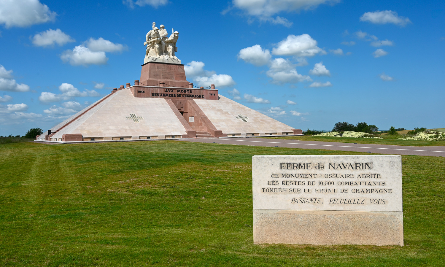 Edifié sous l’impulsion du Général Gouraud, le monument ossuaire de Navarin est surmonté d’un solide groupe de trois patrouilleurs en pierre, dont l’attitude guerrière est orientée au nord-est, œuvre du sculpteur Maxime Real Del Sarte :