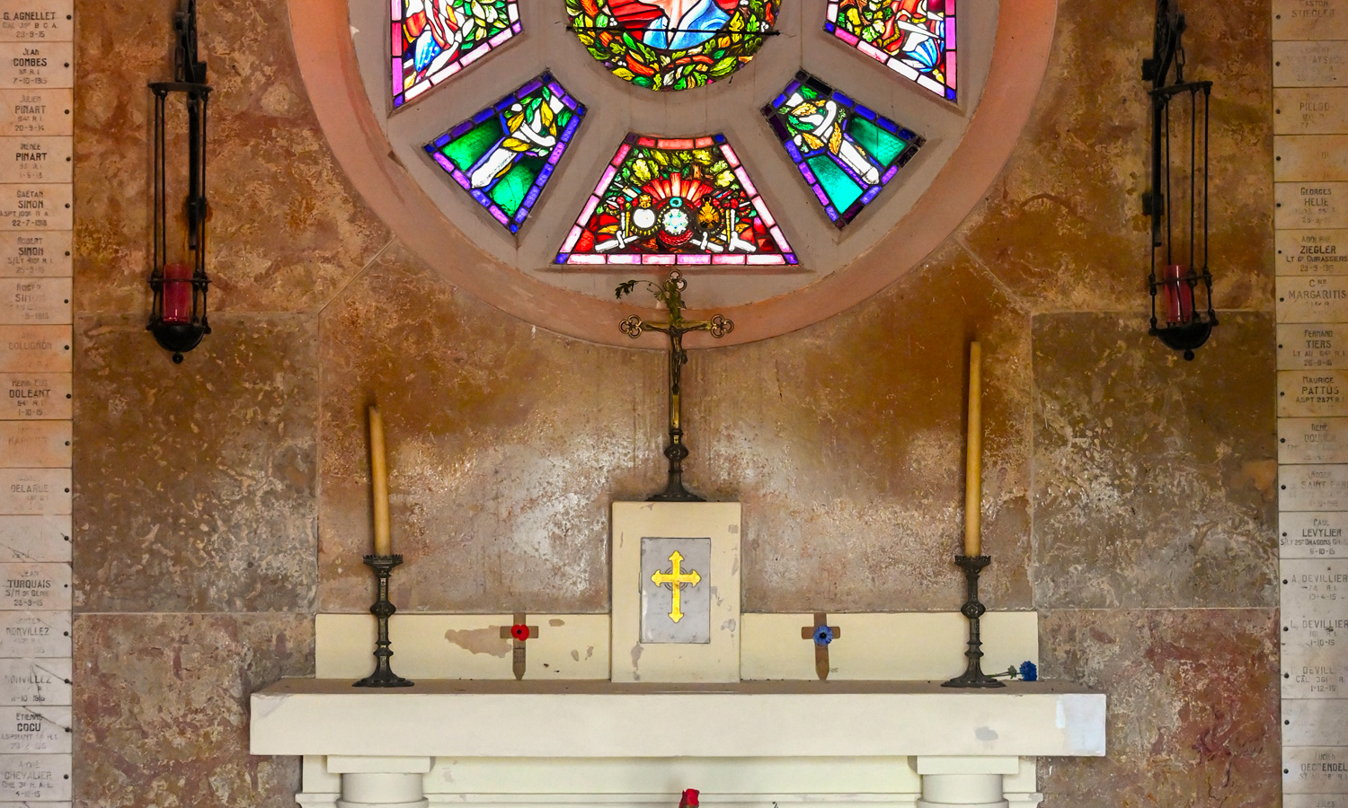 A l'intérieur, la chapelle est tapissée de plus de 1 000 plaques commémoratives apposées par les familles des soldats disparus.