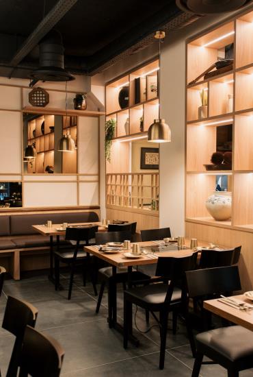 Un cadre contemporain épuré dont les baies vitrées donnent sur un charmant jardin japonais. Un cadre en parfaite harmonie avec la cuisine de Kazuyuki Tanaka, chef japonais.