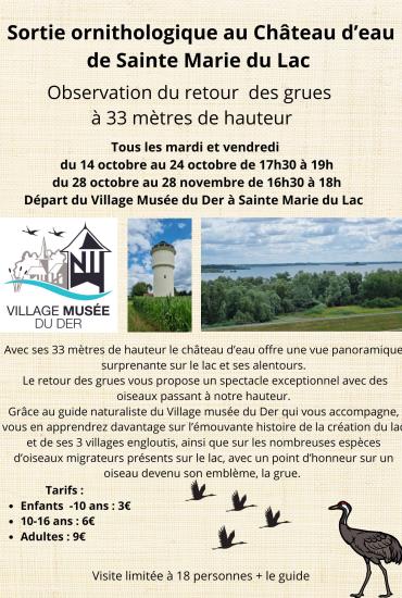 La visite commence avec la découverte de l'architecture à pans de bois, dans un écrin de verdure et de calme. Le Village Musée du Der vous fera découvrir l’incroyable histoire des trois villages disparus pour permettre la construction du Lac du Der (le plus grand lac artificiel d’Europe). Plusieurs bâtiments typiques ont ainsi été sauvés de la destruction ou de la noyade et reconstruits sur le site du musée : l'église de Nuisement-aux-Bois, la Maison du Forgeron, le pigeonnier, etc.